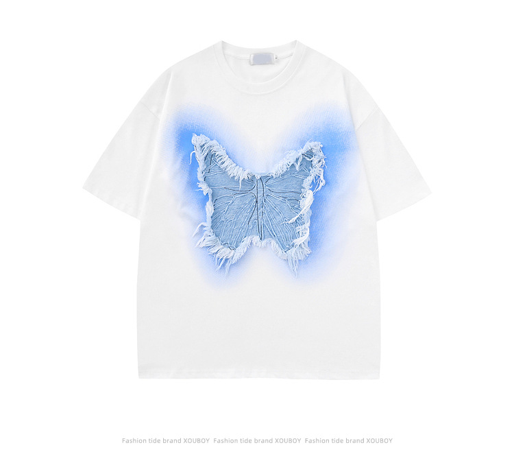 Butterfly denim patchwork short sleeve shirt